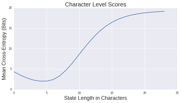 Let us start by looking at how mean crossed-entropy varies with the length of our state for the character based models,
